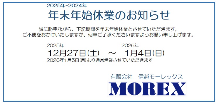誠に勝手ながら2024年12月28日(土)~2025年1月5日(日)を年末年始休業とさせていただきます。ご不便をお掛け致しますが、何卒ご了承くださいますようお願い申し上げます。